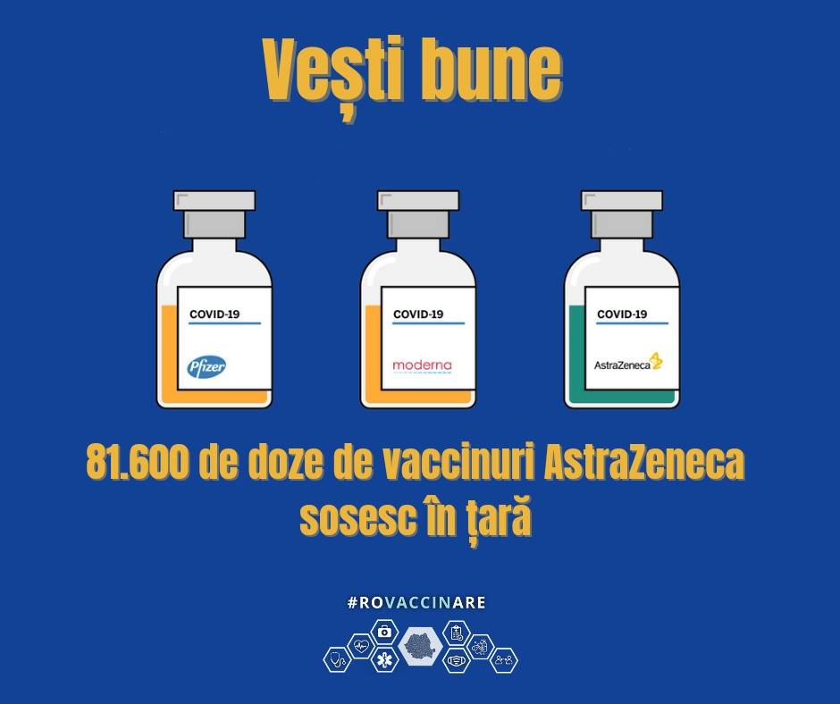 Vaccinul AstraZeneca a ajuns în România! 81.600 doze de vaccin AstraZeneca vor ajunge, mâine dimineață, la Institutul Național de Cercetare Dezvoltare Medico-Militară „Cantacuzino”.