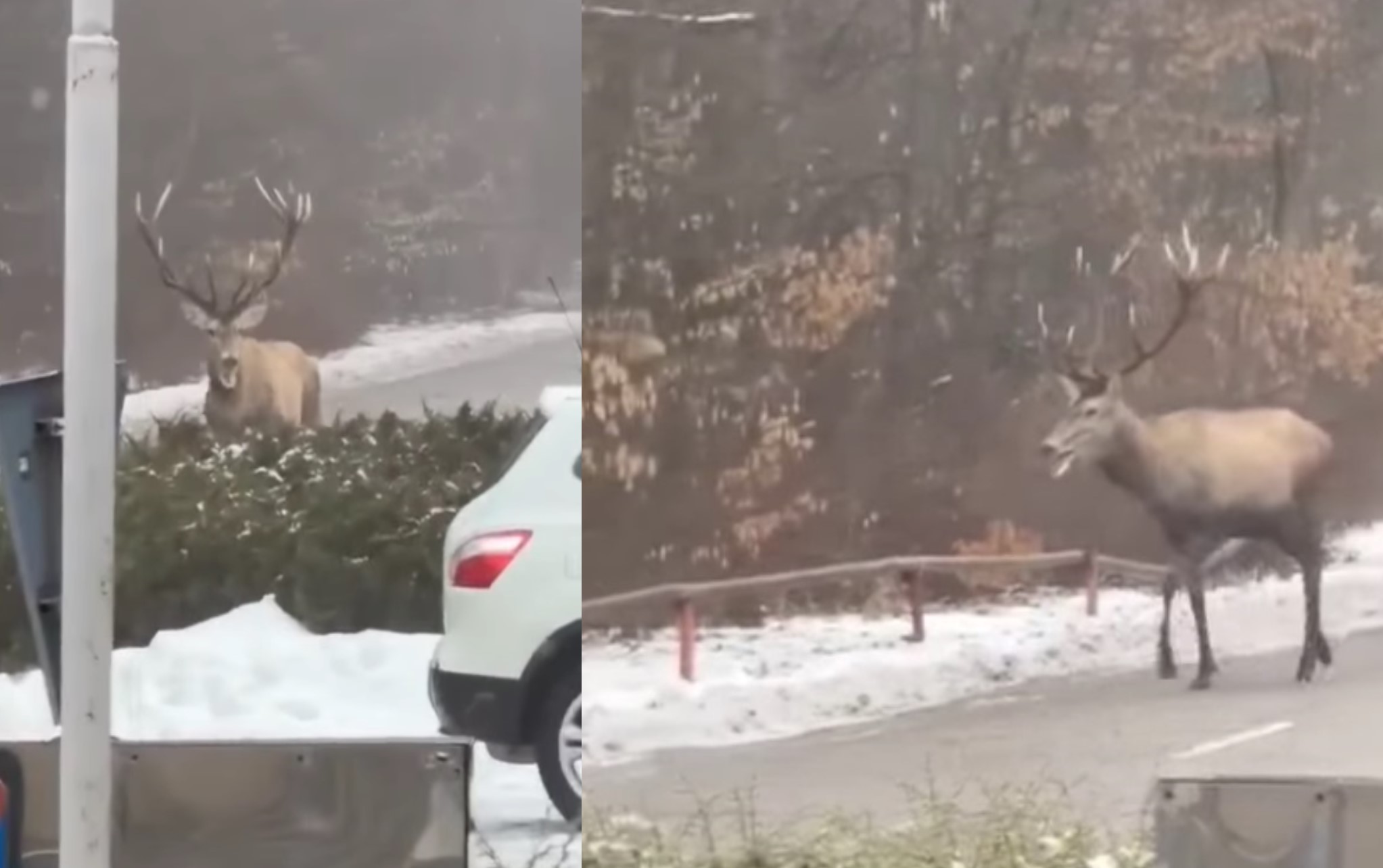 VIDEO. Apariție incredibilă lângă un obiectiv strategic din Argeș. Un cerb ca din povești a dat o raită prin parcare după care a fugit în pădure.