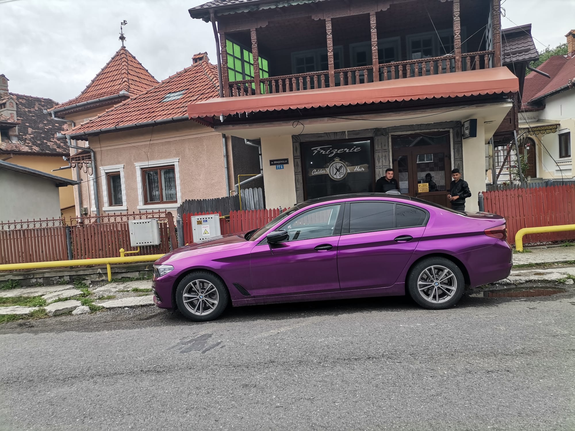 Mașina, un BMW seria 5, G 30 îți ia ochii datorită caroseriei mov. Nici șoferii în trafic dar nici pietonii nu trec indiferenți pe lângă bijuteria pe patru roți.