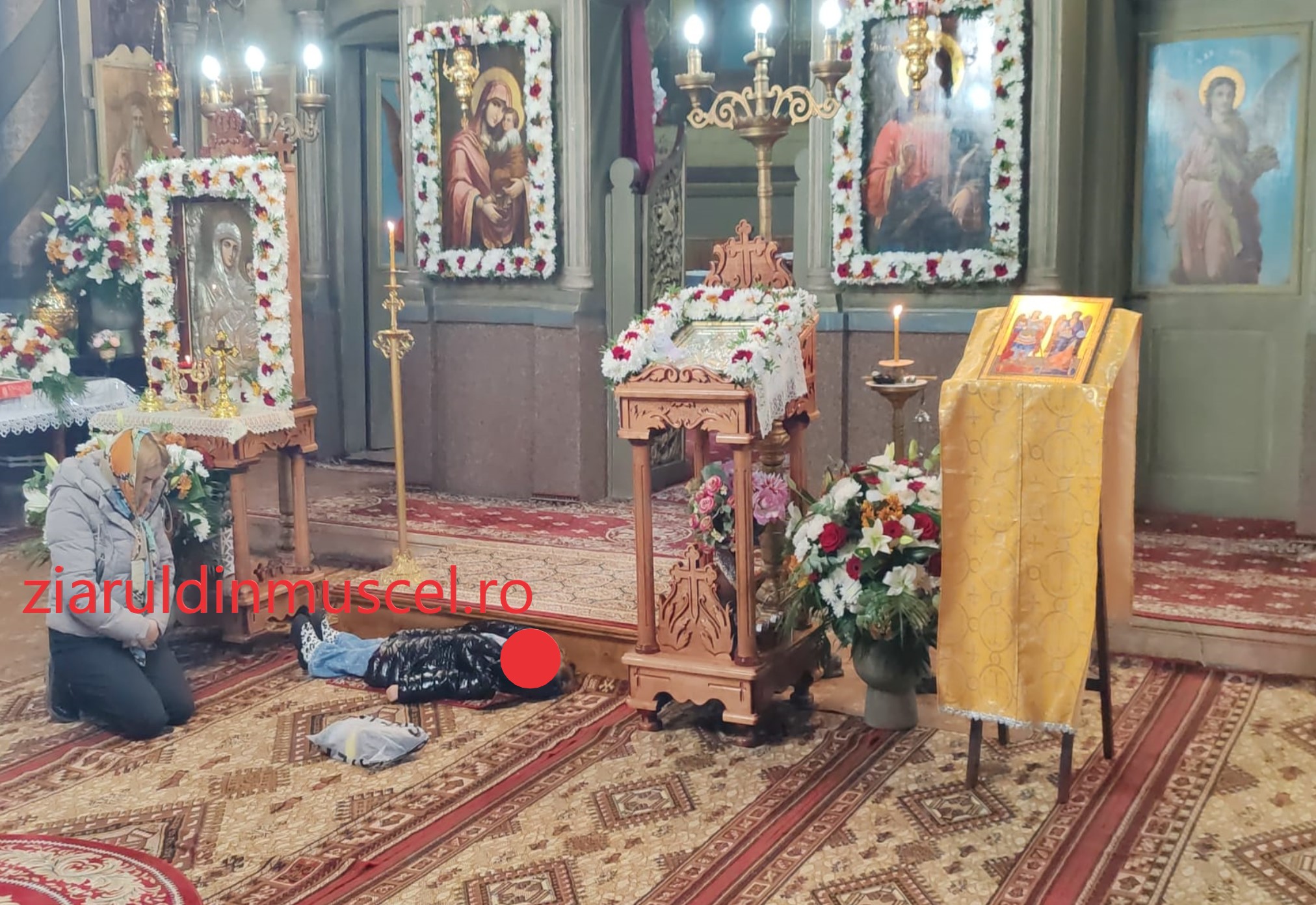 O mămică din localitatea Mihăești a venit cu fetița Anastasia de doar 5 ani, în fața altarului atunci când preoții au ieșit în fața credincioșilor adunați la slujba de hram cu Sfintele Daruri. Fetița s-a întins pe jos și a stat liniștită semn că nu e pentru prima dată când face acest lucru. Mama sa a supravegheat-o în genunchi în poziție de rugăciune.