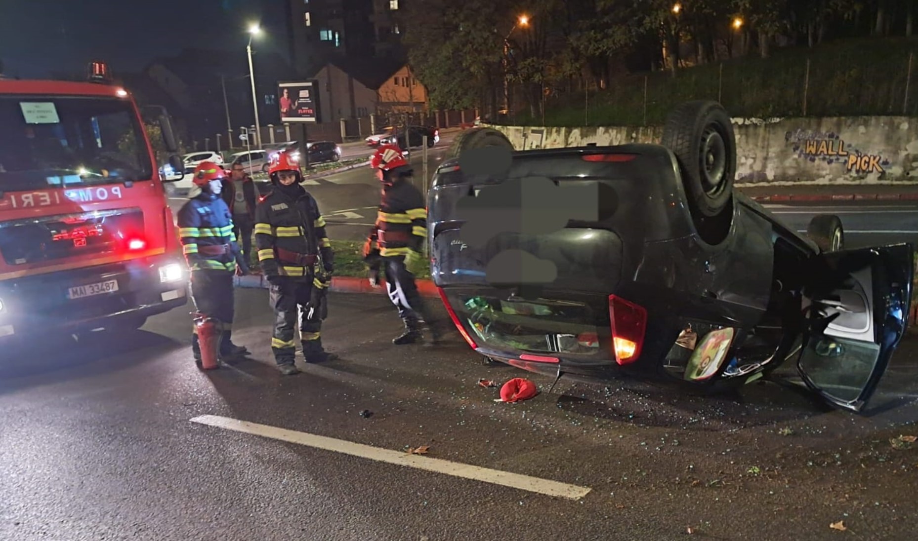 Mașină făcută zob în sensul giratoriu. A rămas cu roțile în sus! Un accident rutier, în urma căruia un autoturism s-a răsturnat a avut loc pe Calea Drăgășani, la sensul giratoriu în Pitești.