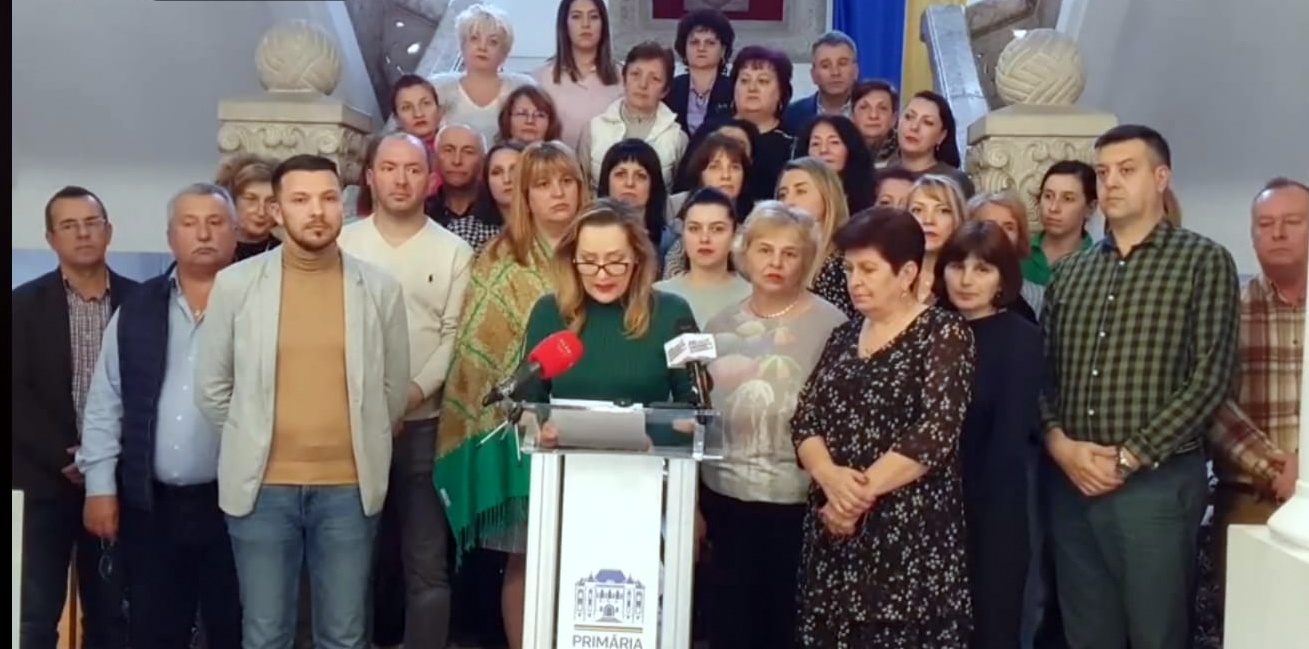 Salariații, mulți la număr au stat aranjați pe scările interioare ale primăriei Câmpulung precum nuntașii la poza de grup, iar mireasa, denumită și Elena din Troia, refăcută din propria cenușă după linșajul mediatic, a dat știrea bombă a zilei.