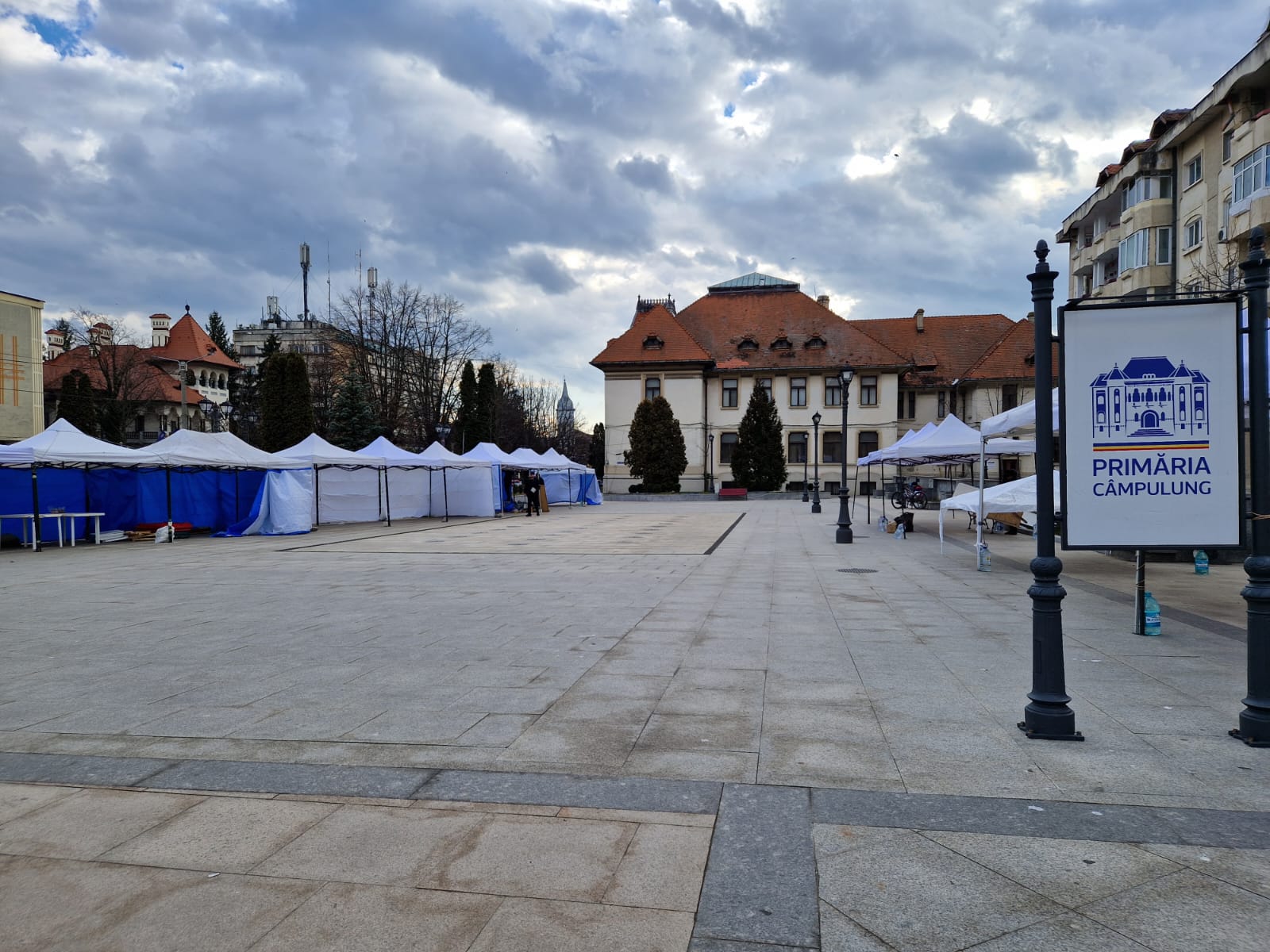 Zeci de corturi albe și-au făcut apariția în piața primăriei din Câmpulung
