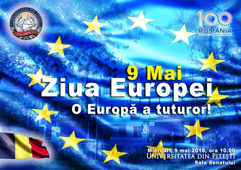 Universitatea din Pitești va marca sărbătorirea Zilei Europei prin evenimentul „Ziua Europei, o Europă a tuturor!”, organizat miercuri, 09 mai 2018, începând cu ora 10.00, în Sala Senatului a Universității din Pitești. Studenții români, cei internaționali și cadrele didactice ale facultăților participă la această sărbătoare cu dorința de a reaminti valorile şi principiile fundamentale care au stat la baza formării Uniunii Europene și de a redescoperi diversitatea pe care o aduce fiecare stat membru la unitatea patrimoniului european.